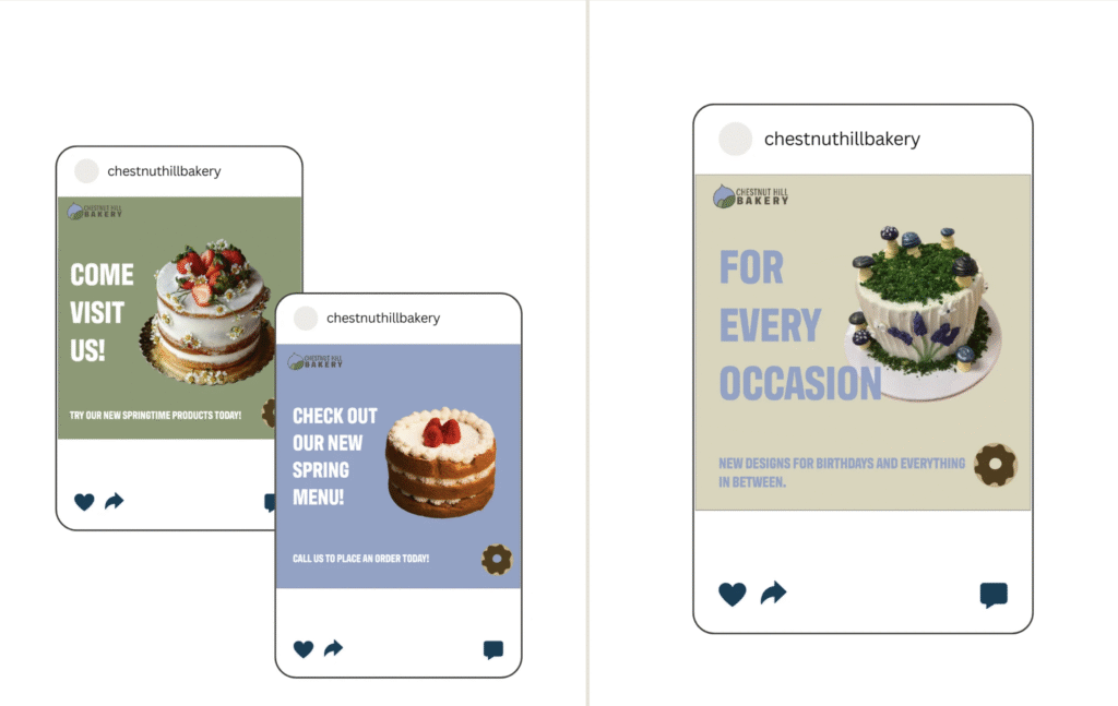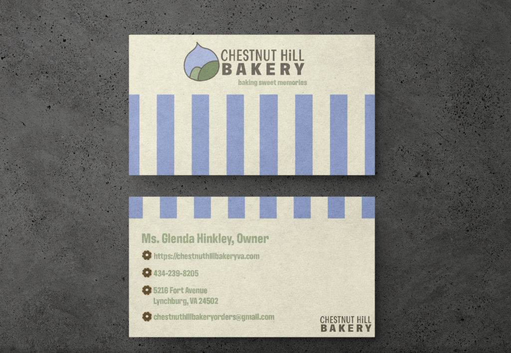 Myself and an assigned group in a university class were tasked with researching a local business’s current brand and create ways to elevate their brand. We researched Chestnut Hill Bakery– a small-town bakery in Lynchburg, Virginia. We found their branding to be simple but inconsistent. In order to elevate their brand, we began a campaign by designing a new business card, website, and pastry packages. Finally, we developed a series of social media posts ideally made to create an Instagram page for the bakery. These posts can even be used as a template for other seasonal posts.