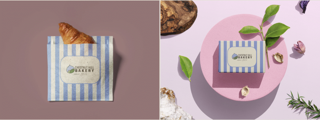 Again, we have our “baker stripes” in our brand colors. The concept of these packages was to gain word-of-mouth advertisement for the bakery as well as build their identity.. We wanted people to see these boxes at parties and be able to identify them right away as belonging to Chestnut Hill Bakery.